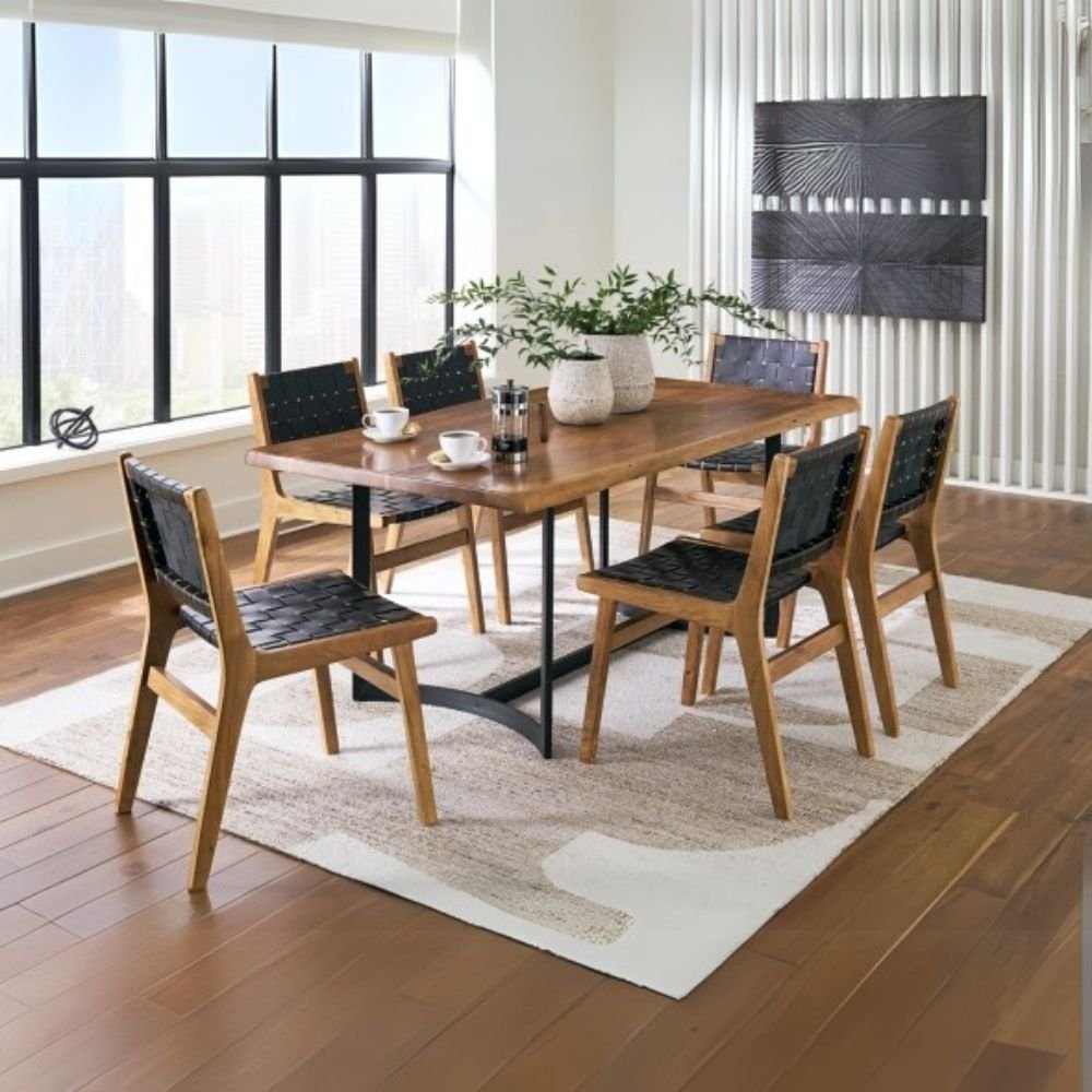 | Dining Room Side Chair (2/CN) | – Made with acacia wood – Solid wood frame – Light wood-tone finish – Woven black leather straps – Nailheads with brass-tone finish – Estimated Assembly Time: 30 minutes |